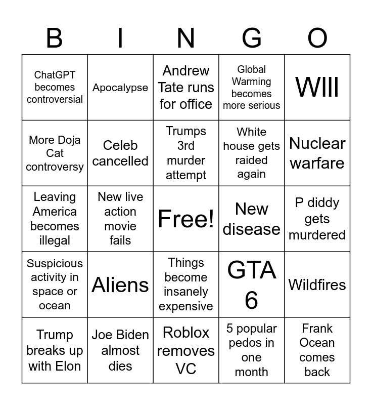 This bingo card has a free space and 24 words: Aliens, Joe Biden almost dies, Trumps 3rd murder attempt, Trump breaks up with Elon, Wlll, ChatGPT becomes controversial, More Doja Cat controversy, Apocalypse, New disease, Things become insanely expensive, White house gets raided again, Leaving America becomes illegal, GTA 6, Wildfires, Celeb cancelled, 5 popular pedos in one month, P diddy gets murdered, Andrew Tate runs for office, Nuclear warfare, New live action movie fails, Frank Ocean comes back, Suspicious activity in space or ocean, Global Warming becomes more serious and Roblox removes VC.