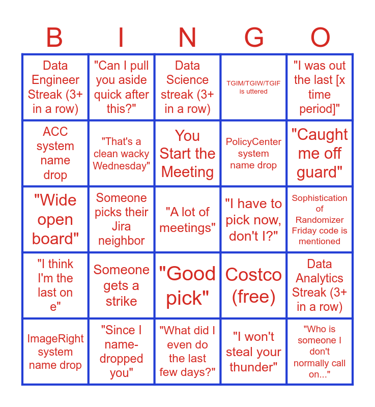 This bingo card has 25 words: Someone gets a strike, "What did I even do the last few days?", You Start the Meeting, ImageRight system name drop, "I was out the last [x time period]", Data Engineer Streak (3+ in a row), ACC system name drop, "Can I pull you aside quick after this?", "I have to pick now, don't I?", "Good pick", PolicyCenter system name drop, "Wide open board", Costco (free), Data Analytics Streak (3+ in a row), "That's a clean wacky Wednesday", "Who is someone I don't normally call on...", Sophistication of Randomizer Friday code is mentioned, Data Science streak (3+ in a row), "Caught me off guard", Someone picks their Jira neighbor, "A lot of meetings", "Since I name-dropped you", "I think I'm the last one", TGIM/TGIW/TGIF is uttered and "I won't steal your thunder".