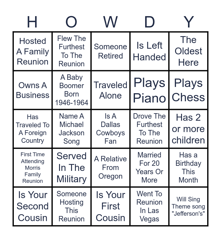 This bingo card has 25 words: Served In The Military, Is Your First Cousin, Traveled Alone, Is Your Second Cousin, The Oldest Here, Hosted A Family Reunion, Owns A Business, Flew The Furthest To The Reunion, Drove The Furthest To The Reunion, A Relative From Oregon, Plays Piano, Has Traveled To A Foreign Country, Married For 20 Years Or More, Has a Birthday This Month, A Baby Boomer Born 1946-1964, Will Sing Theme song "Jefferson's", Has 2 or more children, Someone Retired, Plays Chess, Name A Michael Jackson Song, Is A Dallas Cowboys Fan, Someone Hosting This Reunion, First Time Attending Morris Family Reunion, Is Left Handed and Went To Reunion In Las Vegas.