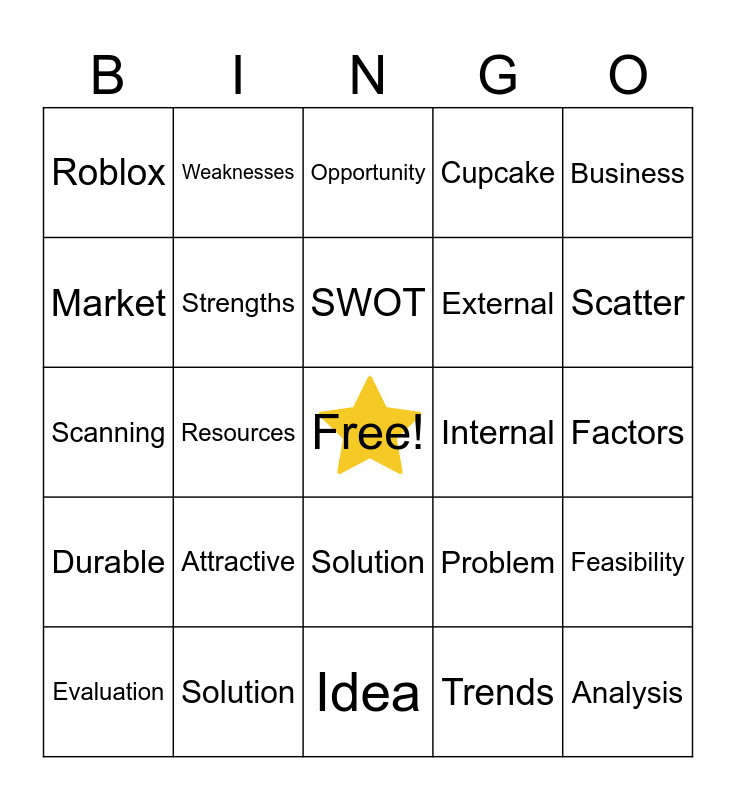 This bingo card has a free space and 24 words: Attractive, Solution, SWOT, Evaluation, Business, Roblox, Market, Weaknesses, Internal, Solution, External, Scanning, Problem, Feasibility, Strengths, Trends, Factors, Opportunity, Scatter, Resources, Analysis, Durable, Cupcake and Idea.