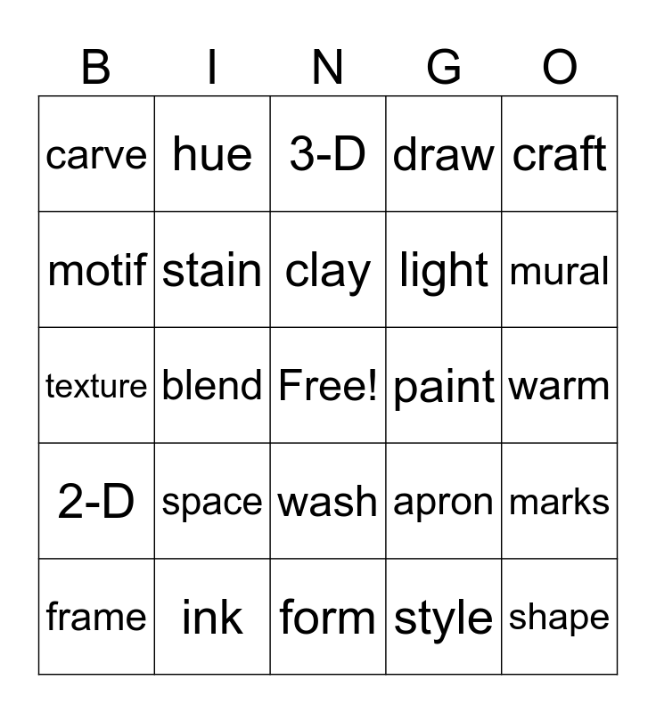 This bingo card has a free space and 49 words: color, shape, line, form, space, value, hue, mix, motif, paste, stain, draw, marks, apron, tint, shade, clay, paint, brush, craft, blend, style, carve, light, sketch, mural, frame, glaze, wash, 2-D, chalk, paper, pencil, crayon, ink, ruler, canvas, tools, warm, cool, layer, swirl, glue, pattern, texture, 3-D, yarn, print and abstract.