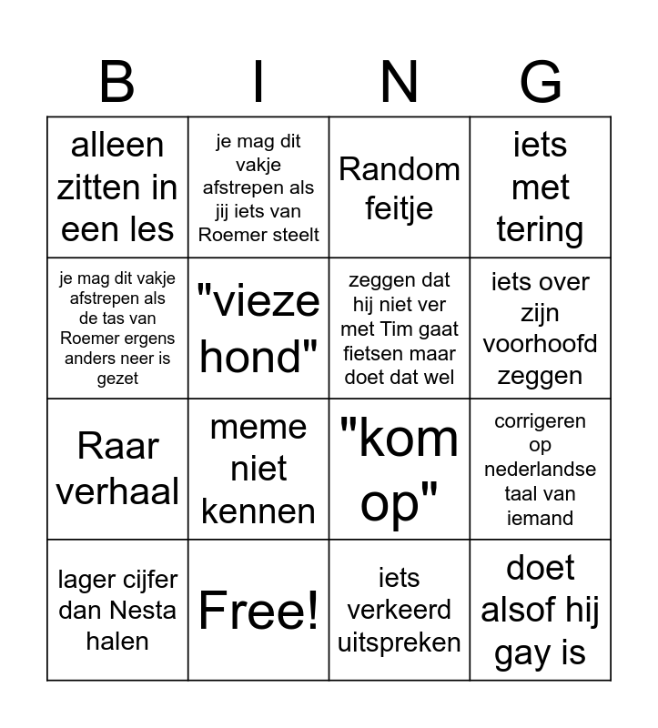 This bingo card has 27 words: *raakt iemand aan*, Rare opmerking, Raar verhaal, "tandjes", "vieze hond", Random feitje, je mag dit vakje afstrepen als jij iets van Roemer steelt, doet alsof hij gay is, Free!, doet alsof hij pedo is, "kom op", iets met tering, nerd, n-woord, meme niet kennen, iets over zijn pc zeggen, zeggen dat hij niet ver met Tim gaat fietsen maar doet dat wel, iets over zijn voorhoofd zeggen, stomme tiktok laten zien, alleen zitten in een les, iets verkeerd uitspreken, iets goed doen tijdens gym, corrigeren op nederlandse taal van iemand, lager cijfer dan Nesta halen, als kakker praten, je mag dit vakje afstrepen als de tas van Roemer ergens anders neer is gezet and snitchen.