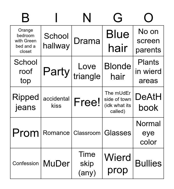 This bingo card has a free space and 24 words: Romance, MuDer, Love triangle, Confession, No on screen parents, Orange bedroom with Green bed and a closet, School roof top, School hallway, The mUdEr side of town (idk what its called), Classroom, Blonde hair, Ripped jeans, Glasses, Normal eye color, Party, Wierd prop, DeAtH book, Drama, Plants in wierd areas, accidental kiss, Bullies, Prom, Blue hair and Time skip (any).