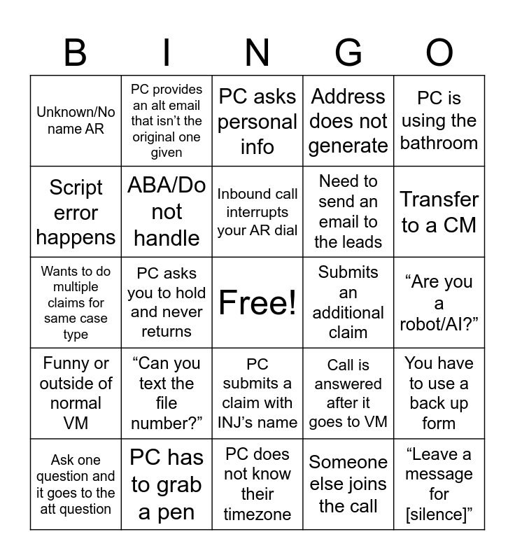 This bingo card has a free space and 29 words: Ask one question and it goes to the att question, You have to repeat file/contact number multiple times, PC asks you to hold and never returns, PC answers “unsure” for most/all questions, Unknown/No name AR, PC asks personal info, ABA/Do not handle, “Can you text the file number?”, Submits an additional claim, PC has to grab a pen, “Are you a robot/AI?”, “Leave a message for [silence]”, PC does not know their timezone, Someone else joins the call, Transfer to a CM, “I don’t even know if I qualify…”, PC submits a claim with INJ’s name, Funny or outside of normal VM, PC is using the bathroom, Wants to do multiple claims for same case type, Call is answered after it goes to VM, Call history has multiple requests for a callback, Need to send an email to the leads, Script error happens, Address does not generate, PC provides an alt email that isn’t the original one given, You have to use a back up form, Inbound call interrupts your AR dial and A city isn’t listed in the dropdown.