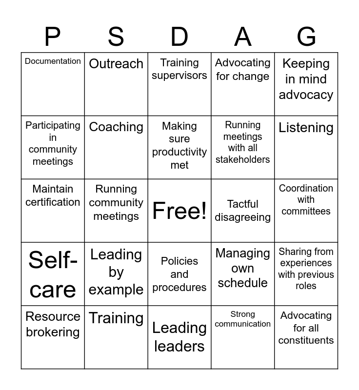 This bingo card has a free space and 44 words: Certification, Leading by example, Quality improvement, Strong communication, Leading the whole state, Rapport building, Coaching, Outcomes and statistics, Advocating for change, Advocating for all constituents, Documentation, Training, Managing own schedule, Coordination with committees, Appropriate disclosure, Coordinating referrals, Leading leaders, Tactful disagreeing, Holding meetings, Maintain certification, Outreach, Policies and procedures, Self-advocacy, Keeping in mind advocacy, Networking, Conflict resolution, Making sure productivity met, Sharing lived experience with lawmakers, Sharing from experiences with previous roles, Resource brokering, Support, Training supervisors, Community presentation skills, Public speaking skills, Self-care, Respecting individuals, Reporting to executives, Openness to feedback, Listening, Participating in community meetings, Running community meetings, Running meetings w County/MCO, Running meetings with all stakeholders and Avoiding being unethical.