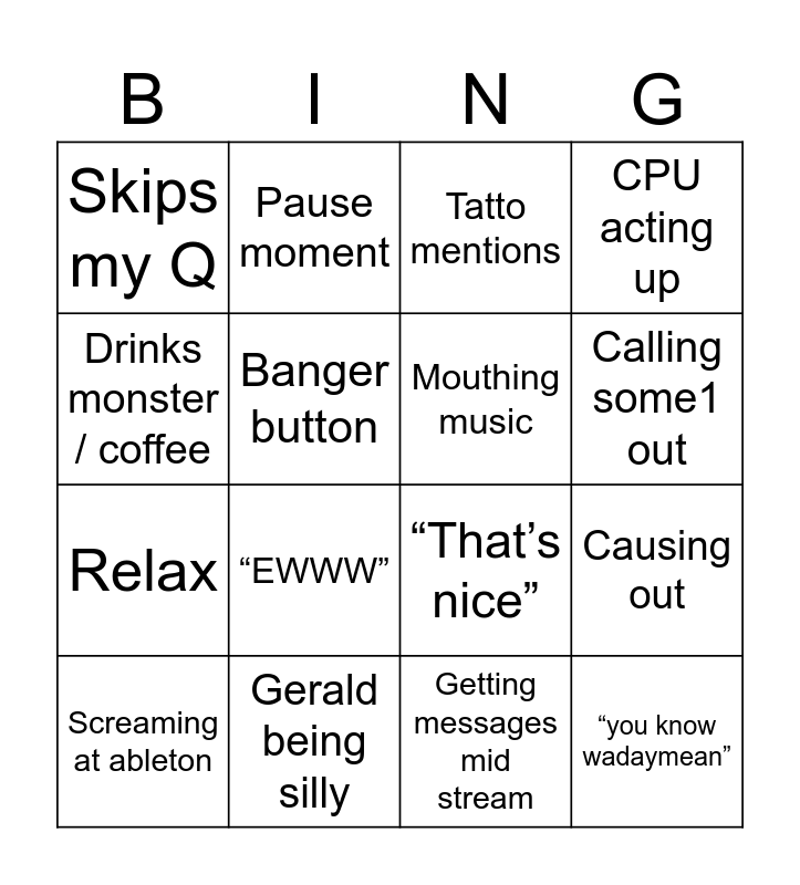 This bingo card has 16 words: Gerald being silly, Causing out, Tatto mentions, Skips my Q, Relax, Pause moment, “That’s nice”, Getting messages mid stream, Drinks monster / coffee, Banger button, Screaming at ableton, CPU acting up, “EWWW”, Calling some1 out, Mouthing music and “you know wadaymean”.