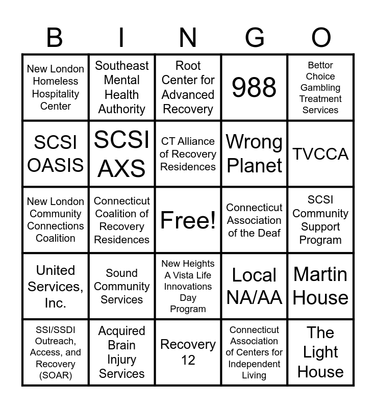 This bingo card has a free space and 24 words: Sound Community Services, Acquired Brain Injury Services, CT Alliance of Recovery Residences, SSI/SSDI Outreach, Access, and Recovery (SOAR), Bettor Choice Gambling Treatment Services, New London Homeless Hospitality Center, SCSI OASIS, Southeast Mental Health Authority, Connecticut Association of the Deaf, New Heights A Vista Life Innovations Day Program, Wrong Planet, New London Community Connections Coalition, Local NA/AA, Martin House, SCSI AXS, Connecticut Association of Centers for Independent Living, SCSI Community Support Program, Root Center for Advanced Recovery, TVCCA, Connecticut Coalition of Recovery Residences, The Light House, United Services, Inc., 988 and Recovery 12.