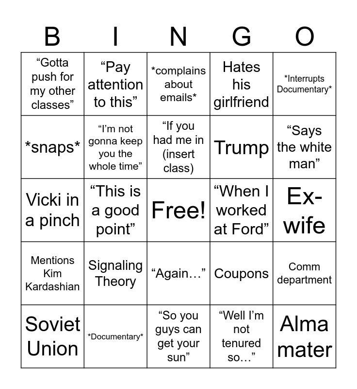This bingo card has a free space and 24 words: Signaling Theory, *Documentary*, “If you had me in (insert class), Soviet Union, *Interrupts Documentary*, “Gotta push for my other classes”, *snaps*, “Pay attention to this”, “When I worked at Ford”, “Again…”, Trump, Vicki in a pinch, Coupons, Comm department, “I’m not gonna keep you the whole time”, “Well I’m not tenured so…”, Ex-wife, *complains about emails*, “Says the white man”, “This is a good point”, Alma mater, Mentions Kim Kardashian, Hates his girlfriend and “So you guys can get your sun”.
