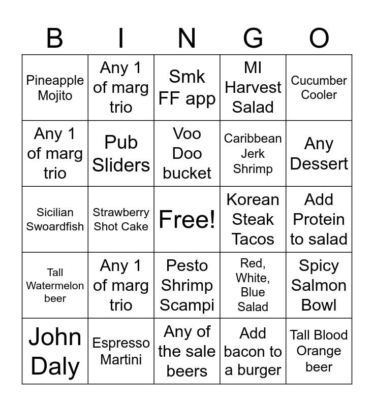 This bingo card has a free space and 24 words: Any 1 of marg trio, Espresso Martini, Voo Doo bucket, John Daly, Cucumber Cooler, Pineapple Mojito, Any 1 of marg trio, Any 1 of marg trio, Korean Steak Tacos, Pesto Shrimp Scampi, Caribbean Jerk Shrimp, Sicilian Swoardfish, Red, White, Blue Salad, Spicy Salmon Bowl, Pub Sliders, Add bacon to a burger, Add Protein to salad, Smk FF app, Any Dessert, Strawberry Shot Cake, Tall Blood Orange beer, Tall Watermelon beer, MI Harvest Salad and Any of the sale beers.