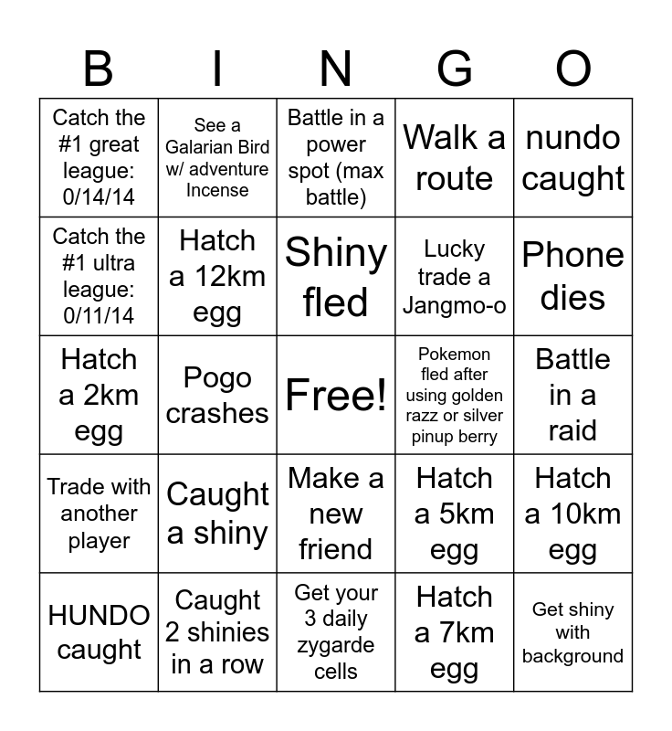 This bingo card has a free space and 24 words: Caught a shiny, Caught 2 shinies in a row, Shiny fled, HUNDO caught, nundo caught, Catch the #1 great league: 0/14/14, Catch the #1 ultra league: 0/11/14, See a Galarian Bird w/ adventure Incense, Pokemon fled after using golden razz or silver pinup berry, Make a new friend, Lucky trade a Jangmo-o, Hatch a 2km egg, Hatch a 5km egg, Hatch a 10km egg, Hatch a 12km egg, Hatch a 7km egg, Battle in a raid, Battle in a power spot (max battle), Phone dies, Pogo crashes, Get shiny with background, Trade with another player, Walk a route and Get your 3 daily zygarde cells.