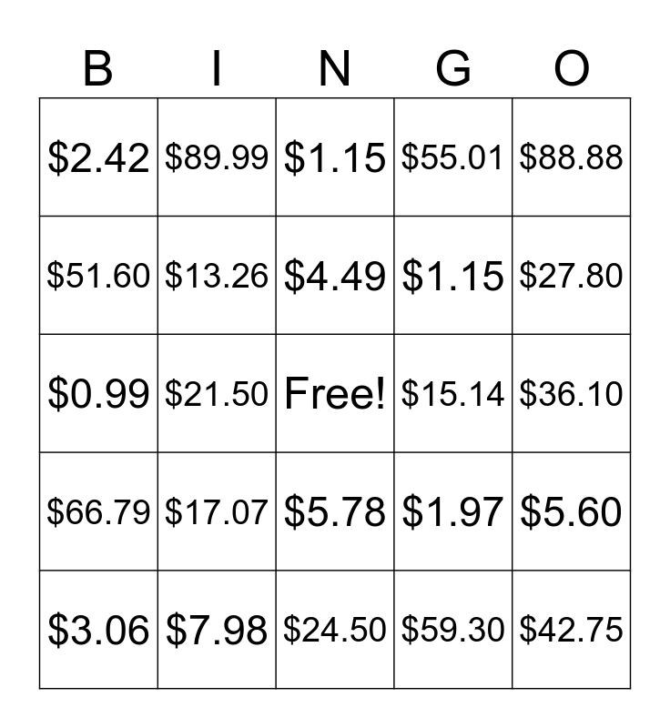 This bingo card has a free space and 29 words: $3.06, $10.00, $21.50, $16.05, $2.42, $1.15, $13.26, $17.07, $15.14, $7.98, $36.10, $42.75, $24.50, $59.30, $27.80, $0.75, $5.78, $66.79, $88.88, $0.99, $1.97, $2.75, $1.15, $51.60, $55.01, $89.99, $5.60, $4.49 and $47.25.