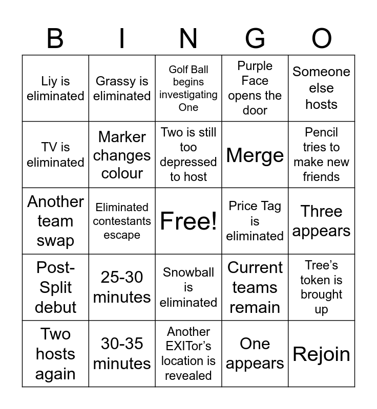 This bingo card has a free space and 24 words: 25-30 minutes, 30-35 minutes, Two is still too depressed to host, Two hosts again, Someone else hosts, Liy is eliminated, TV is eliminated, Grassy is eliminated, Price Tag is eliminated, Snowball is eliminated, Merge, Another team swap, Current teams remain, Tree’s token is brought up, Marker changes colour, One appears, Three appears, Golf Ball begins investigating One, Pencil tries to make new friends, Eliminated contestants escape, Rejoin, Post-Split debut, Purple Face opens the door and Another EXITor’s location is revealed.