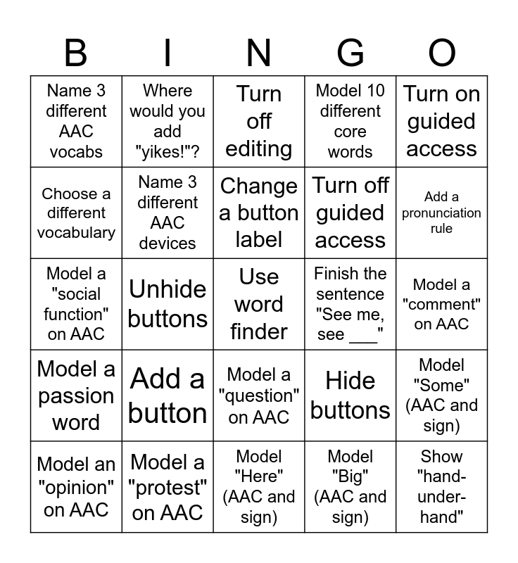 This bingo card has a free space and 24 words: Add a button, Model a "protest" on AAC, Change a button label, Model an "opinion" on AAC, Turn on guided access, Name 3 different AAC vocabs, Choose a different vocabulary, Where would you add "yikes!"?, Finish the sentence "See me, see ___", Model a "question" on AAC, Turn off guided access, Model a "social function" on AAC, Hide buttons, Model "Some" (AAC and sign), Name 3 different AAC devices, Model "Big" (AAC and sign), Model a "comment" on AAC, Turn off editing, Add a pronunciation rule, Unhide buttons, Show "hand-under-hand", Model a passion word, Model 10 different core words and Model "Here" (AAC and sign).