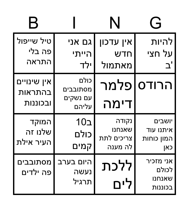 This bingo card has 20 words: יושבים איתנו עוד המון כוחות כאן, יש צפי לחדירה, אין עדכון חדש מאתמול, אנחנו צריכים להיות מוכנים להכול, מסתובבים פה ילדים, אין שינויים בהתראות ובכוננות, היום בערב נעשה תרגיל, טיל שייפול פה בלי התראה, המוקד שלנו זה העיר אילת, גם אני הייתי ילד, ב10 כולם קמים, נקודה שאנחנו צריכים לתת לה מענה, כולם מסתובבים עם נשקים עליהם, אני מזכיר לכולם שאנחנו בכוננות, פלמר דימה, מחכים לפשיטה, הרודס, להיות על חצי ב', ללכת לים and בואו נשמור על הנקיון.