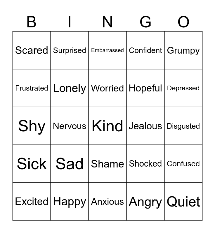 This bingo card has a free space and 24 words: Sad, Happy, Worried, Excited, Grumpy, Scared, Frustrated, Surprised, Jealous, Shame, Hopeful, Shy, Shocked, Confused, Lonely, Angry, Disgusted, Embarrassed, Depressed, Nervous, Quiet, Sick, Confident and Anxious.