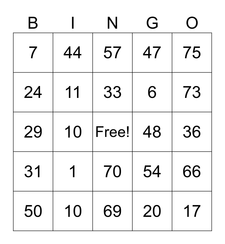 This bingo card has a free space and 24 words: 1, 10, 33, 50, 75, 7, 24, 44, 48, 70, 6, 29, 54, 66, 11, 20, 36, 57, 73, 10, 17, 31, 47 and 69.