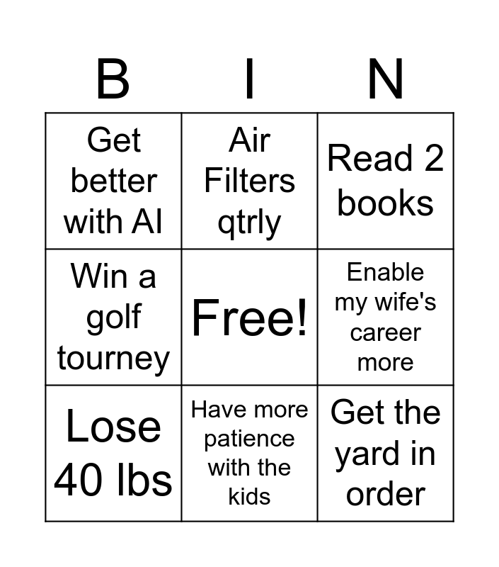 This bingo card has a free space and 11 words: Break 80, Have more patience with the kids, Get the yard in order, Lose 40 lbs, Air Filters qtrly, Read 2 books, Enable my wife's career more, Play more Guitar, Win a golf tourney, Get better with AI and Figure out what to do with all my memorabillia.