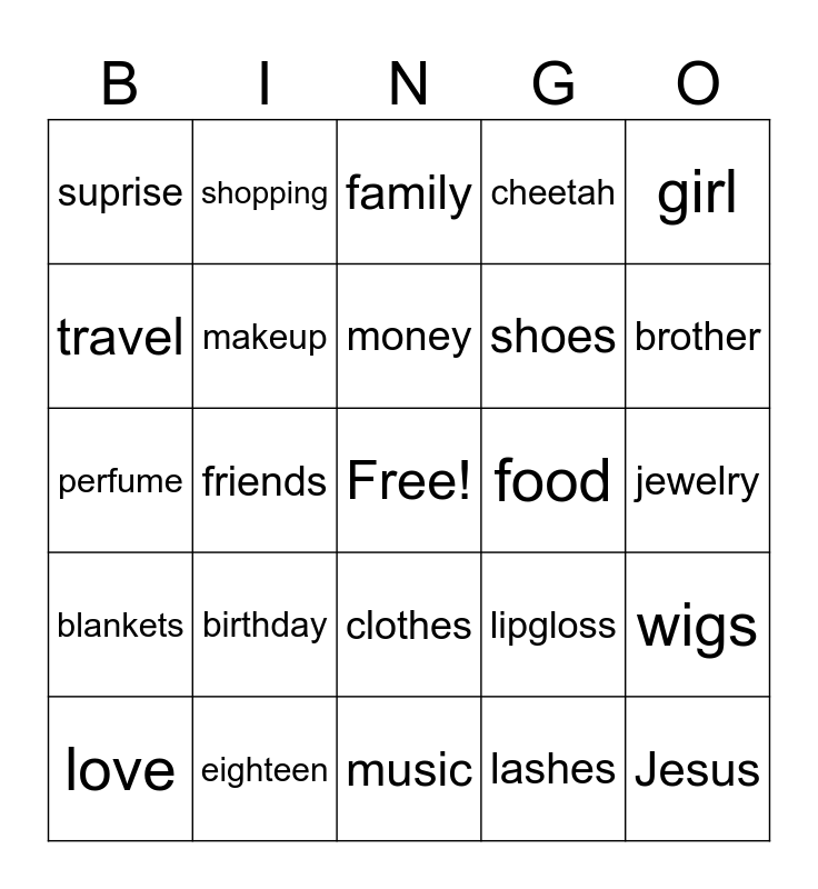 This bingo card has a free space and 24 words: birthday, eighteen, money, love, girl, suprise, travel, shopping, food, clothes, shoes, perfume, lipgloss, wigs, makeup, lashes, jewelry, family, brother, friends, Jesus, blankets, cheetah and music.