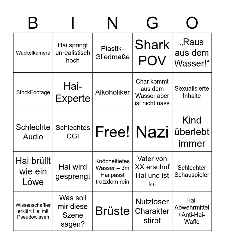 This bingo card has a free space and 31 words: Brüste, Unnötige Bikiniszene, Schlechtes CGI, Hai ist nur eine Puppe, Wackelkamera, Plastik-Gliedmaße, Hai-Experte, Vater von XX erschuf Hai und ist tot, Nazi, Nutzloser Charakter stirbt, Kind überlebt immer, Hai-Abwehrmittel / Anti-Hai-Waffe, Hai-Existenz wird abgestritten, Polizei/Armee nutzlos, Sexualisierte Inhalte, Wiederverwendete Szenen, Schlechter Schauspieler, Hai wird gesprengt, Hai brüllt wie ein Löwe, Knöcheltiefes Wasser – 3m Hai passt trotzdem rein, „Raus aus dem Wasser!“, Hai greift an Land an, Wissenschaftler erklärt Hai mit Pseudowissen, Hai springt unrealistisch hoch, Char kommt aus dem Wasser aber ist nicht nass, StockFootage, Shark POV, Schlechte Audio, Was soll mir diese Szene sagen?, Alkoholiker and Teaser zweiter Teil!?.