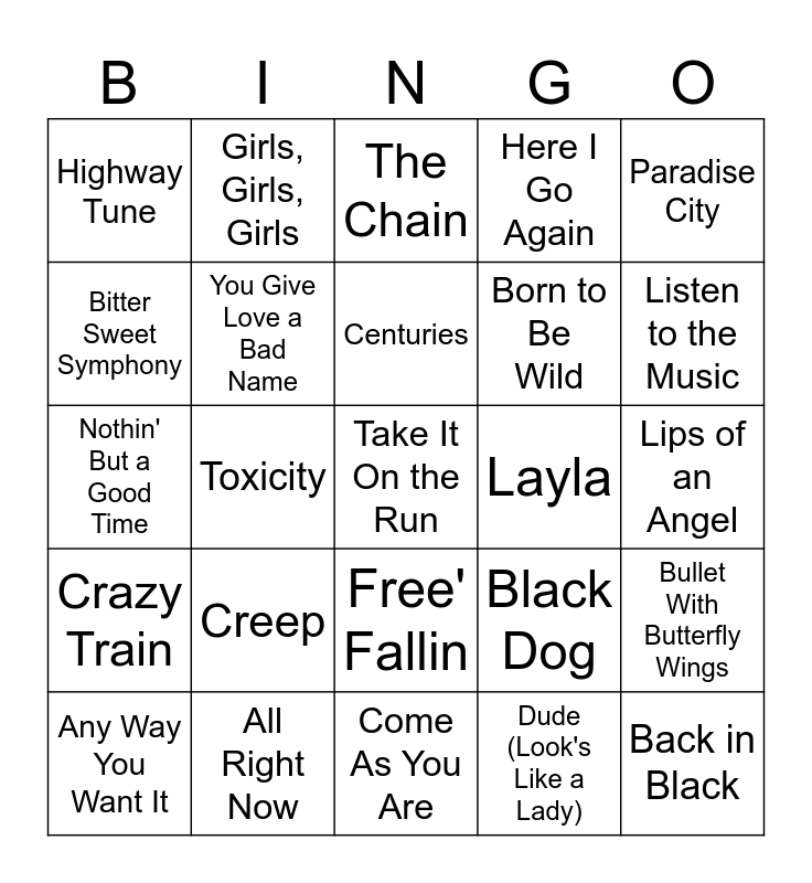 This bingo card has 34 words: Back in Black, Dude (Look's Like a Lady), Roll on Down the Highway, Eye of the Tiger, Crazy Train, You Give Love a Bad Name, Paradise City, Any Way You Want It, Girls, Girls, Girls, Should I Stay or Should I Go, Centuries, The Chain, Numb, Higher, Layla, Listen to the Music, All Right Now, Nothin' But a Good Time, Creep, Black Dog, Free' Fallin, Hold On Loosely, Highway Tune, Lips of an Angel, Come As You Are, Take It On the Run, Here I Go Again, Ain't Talkin' 'Bout Love, Born to Be Wild, Bitter Sweet Symphony, Paint It Black, Toxicity, Bullet With Butterfly Wings and White Wedding, Pt. 1.