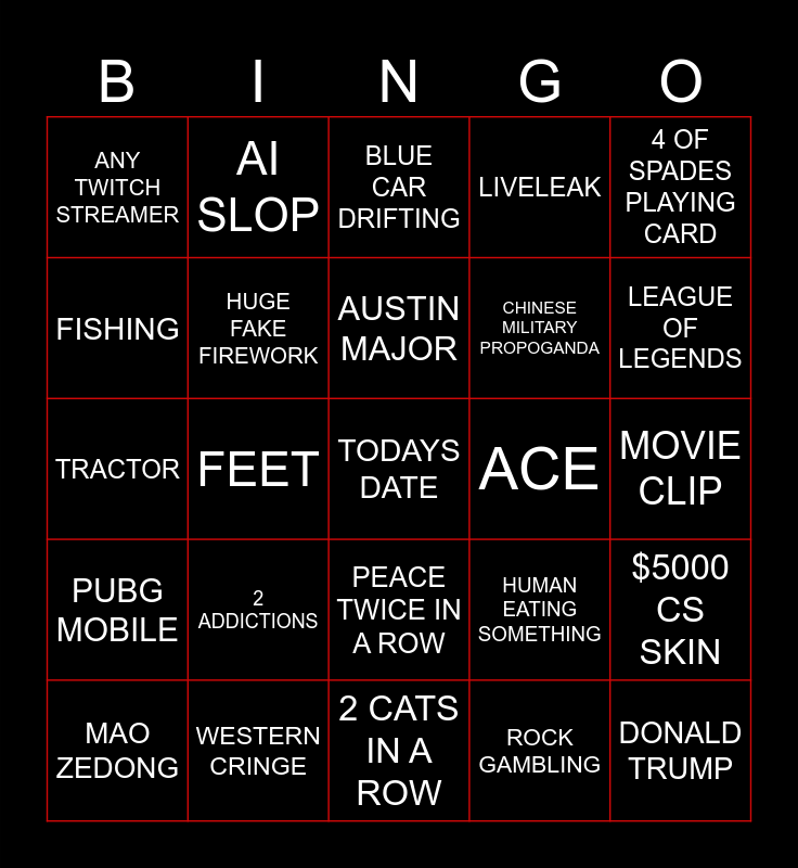 This bingo card has a free space and 24 words: 2 ADDICTIONS, WESTERN CRINGE, AUSTIN MAJOR, MAO ZEDONG, 4 OF SPADES PLAYING CARD, ANY TWITCH STREAMER, FISHING, AI SLOP, ACE, PEACE TWICE IN A ROW, CHINESE MILITARY PROPOGANDA, TRACTOR, HUMAN EATING SOMETHING, $5000 CS SKIN, HUGE FAKE FIREWORK, ROCK GAMBLING, MOVIE CLIP, BLUE CAR DRIFTING, LEAGUE OF LEGENDS, FEET, DONALD TRUMP, PUBG MOBILE, LIVELEAK and 2 CATS IN A ROW.