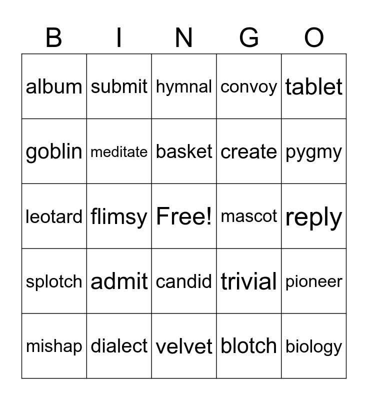 This bingo card has a free space and 25 words: admit, velvet, basket, mishap, tablet, album, goblin, submit, mascot, candid, create, leotard, trivial, pioneer, meditate, symbol, reply, hymnal, pygmy, flimsy, biology, dialect, splotch, convoy and blotch.
