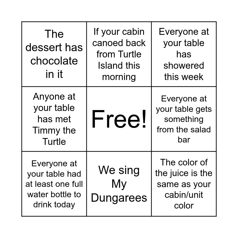 This bingo card has 23 words: 4+ people at your table are wearing Crocs, Lilka asks “What time is it?”, We sing My Dungarees, We sing Bazooka Bubblegum, Free!, The dessert has chocolate in it, Everyone at your table gets something from the salad bar, If your cabin canoed back from Turtle Island this morning, If your counsellors all high-five Scott by the end of the meal, 2+ people at your table are wearing hats, Someone at your table is taking a performance class this week, The color of the juice is the same as your cabin/unit color, Both your counsellors are wearing name tags, Someone at your table is taking a waterfront class this week, Any of your counsellors are international, If you have started working on your cabin/unit logbook page, Everyone at your table has showered this week, 3+ people at your table are wearing friendship bracelets, Everyone at your table had at least one full water bottle to drink today, Anyone at your table is wearing nail polish, Anyone at your table has met Timmy the Turtle, You have won squeaky or clean this week and Any of your counsellors have been on the song block this week.
