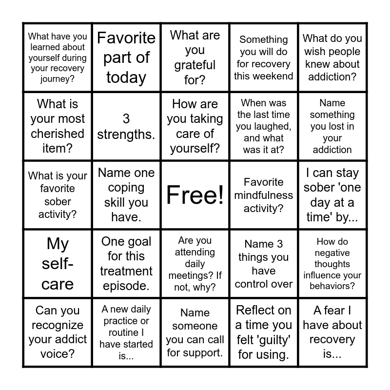 This bingo card has a free space and 29 words: Can you recognize your addict voice?, Biggest motivation for recovery is..., Name one coping skill you have., Name 3 of your relapse warning signs., What have you learned about yourself during your recovery journey?, What are you grateful for?, 3 strengths., One goal for this treatment episode., Favorite mindfulness activity?, A new daily practice or routine I have started is..., I can stay sober 'one day at a time' by..., A fear I have about recovery is..., Name someone you can call for support., Reflect on a time you felt 'guilty' for using., Name something you lost in your addiction, Number of meetings, Are you attending daily meetings? If not, why?, My self-care, What do you wish people knew about addiction?, What is your favorite sober activity?, Name 3 things you have control over, Who is the most influential person in your life?, When was the last time you laughed, and what was it at?, What is your most cherished item?, Something you will do for recovery this weekend, Favorite part of today, How do negative thoughts influence your behaviors?, How are you taking care of yourself? and A feeling word.