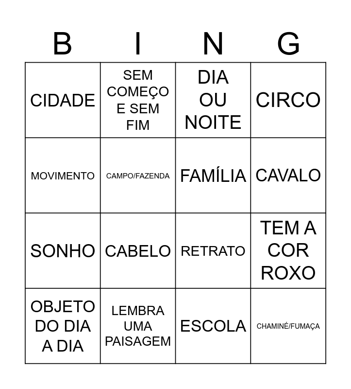 This bingo card has 16 words: LEMBRA UMA PAISAGEM, TEM A COR ROXO, DIA OU NOITE, CIDADE, SONHO, SEM COMEÇO E SEM FIM, RETRATO, ESCOLA, MOVIMENTO, CAMPO/FAZENDA, OBJETO DO DIA A DIA, CIRCO, CABELO, CAVALO, FAMÍLIA and CHAMINÉ/FUMAÇA.