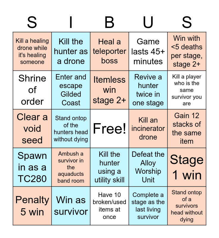 This bingo card has a free space and 59 words: Kill tp boss or a player with fuel array, Win as survivor, Defeat False Son or Voidling, Spawn in as a TC280, Complete a stage as the last living survivor, Enter and escape Void Fields, Enter and escape Gilded Coast, Complete a Shrine of the mountain tp, Revive a hunter twice in one stage, Become Heretic, Game lasts 45+ minutes, Ping sibus while he's invisible, Shrine of order, Kill a player using an equipment, Lure survivors with a dropped item and kill them, Kill a healing drone while it's healing someone, Stand ontop of a survivors head without dying, Win with <5 deaths per stage, stage 2+, Kill the same survivor twice in one stage (not drone), Itemless win stage 2+, Kill an incinerator drone, Heal a teleporter boss, Penalty 5 win, Stage 1 win, Win as Engineer, Win as Commando, Win as Captain, Win as Artificer, Kill a player who is the same survivor you are, Win as MULT, Have 50+ items, Kill a player using DOT, 3+ of the same character in one game (minus sibus), Ahoy!, Kill the hunter as a drone, Acquire a Pearl/Irr. Pearl, Acquire Red scrap, Stand ontop of the hunters head without dying, As a drone, lead an enemy off the map, Clear a void seed, Hit a survivor with a twisted elite crystal, Ambush a survivor in the aquaducts band room, Gain 12 stacks of the same item, Win during the tp event, Buy a red from the bazaar, 20 egocentrism my beloved, As a chimera exploder, kill an enemy after dying, Throw the hunter offstage, Kill the hunter using a utility skill, Have 10 broken/used items at once, Convince a random player to say "Quack" in chat, Enter stage 2 before 10:00, Pillar Skip, Enter any Path of the Collosus stage, Achieve 100% crit chance, Defeat the Alloy Worship Unit, Reach the skybox, Aquaduct Bands and Collect an environment or monster log.