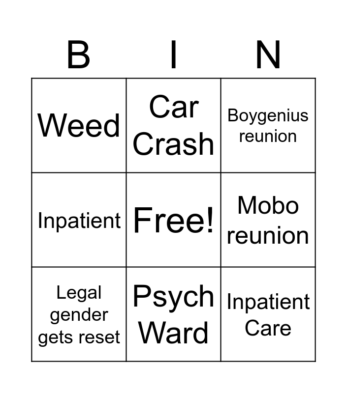 This bingo card has a free space and 11 words: Transfer, Psych Ward, Inpatient Care, Legal gender gets reset, Car Crash, Boygenius reunion, Mobo reunion, Weed, Inpatient, Weed and Psych Ward.