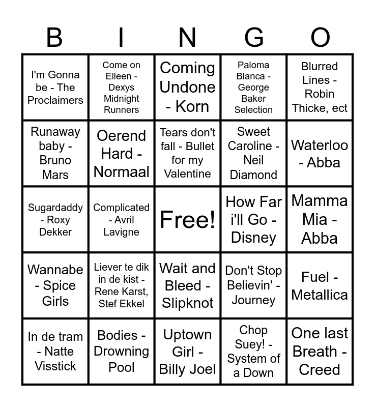 This bingo card has a free space and 39 words: Fly as me - Bruno Mars, Boyfriend - Tyler Cassidy, Baat het nier dan schaadt het niet - Bökkers, Oerend Hard - Normaal, In de tram - Natte Visstick, Wait and Bleed - Slipknot, Tears don't fall - Bullet for my Valentine, Het is al laat toch - Racoon, Blurred Lines - Robin Thicke, ect, Wannabe - Spice Girls, Complicated - Avril Lavigne, Paloma Blanca - George Baker Selection, One last Breath - Creed, Mamma Mia - Abba, How Far i'll Go - Disney, Liever te dik in de kist - Rene Karst, Stef Ekkel, La Bamba - Los Lobos, I'm Gonna be - The Proclaimers, You Give Love a bad Name - Bon Jovi, Don't Stop Believin' - Journey, Runaway baby - Bruno Mars, Uptown Girl - Billy Joel, Sweet Caroline - Neil Diamond, Waterloo - Abba, Piano man - Billy Joel, Walking on Sunshine - Dancing Queen, Africa - TOTO, We are the Champions - Queen, Sweet Child o'mine - Guns n'Roses, Come on Eileen - Dexys Midnight Runners, 99 Luftballons- Nena, Take on me - A-ha, Coming Undone - Korn, Bodies - Drowning Pool, Chop Suey! - System of a Down, Die MF Die - Dope, Fuel - Metallica, Sugardaddy - Roxy Dekker and Sweet Monica - Meltheads.