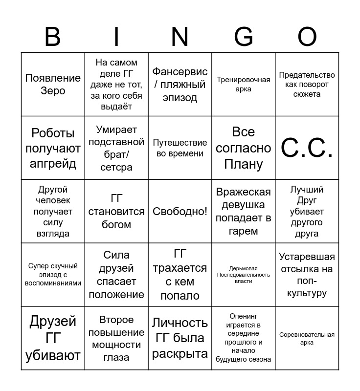 This bingo card has a free space and 24 words: Сила друзей спасает положение, Второе повышение мощности глаза, Путешествие во времени, Друзей ГГ убивают, Предательство как поворот сюжета, Появление Зеро, Роботы получают апгрейд, На самом деле ГГ даже не тот, за кого себя выдаёт, Вражеская девушка попадает в гарем, ГГ трахается с кем попало, Все согласно Плану, Другой человек получает силу взгляда, Дерьмовая Последовательность власти, Устаревшая отсылка на поп-культуру, Умирает подставной брат/сетсра, Опенинг играется в середине прошлого и начало будущего сезона, Лучший Друг убивает другого друга, Фансервис / пляжный эпизод, С.С., ГГ становится богом, Соревновательная арка, Супер скучный эпизод с воспоминаниями, Тренировочная арка and Личность ГГ была раскрыта.