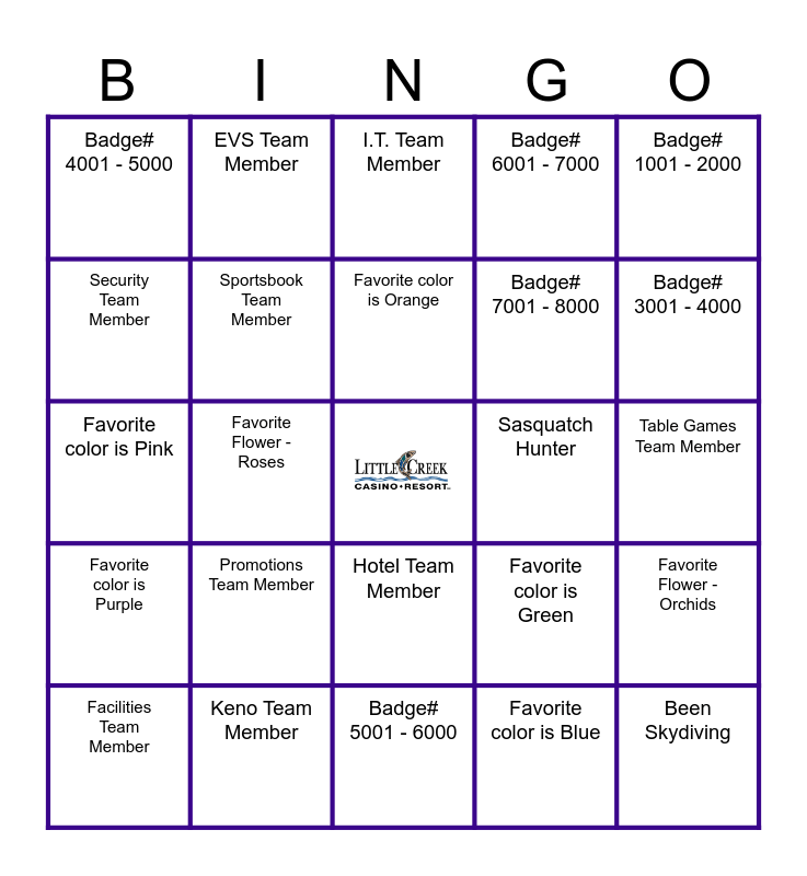 This bingo card has a free space and 34 words: Badge# 0000 - 1000, Favorite color is Blue, Starlight Team Member, Cage Team Member, Favorite color is Purple, Sportsbook Team Member, Badge# 1001 - 2000, Facilities Team Member, EVS Team Member, Deli Team Member, Favorite color is Orange, I.T. Team Member, Badge# 2001 - 3000, Spa Team Member, Sasquatch Hunter, Badge# 3001 - 4000, Keno Team Member, Favorite color is Pink, Promotions Team Member, Favorite color is Green, Hotel Team Member, MIS Team Member, Badge# 4001 - 5000, Table Games Team Member, Badge# 5001 - 6000, Been Skydiving, Badge# 6001 - 7000, Been Ziplining, Badge# 7001 - 8000, Security Team Member, Poker Team Member, Favorite Flower - Roses, Favorite Flower - Orchids and Favorite Flower - Sunflowers.
