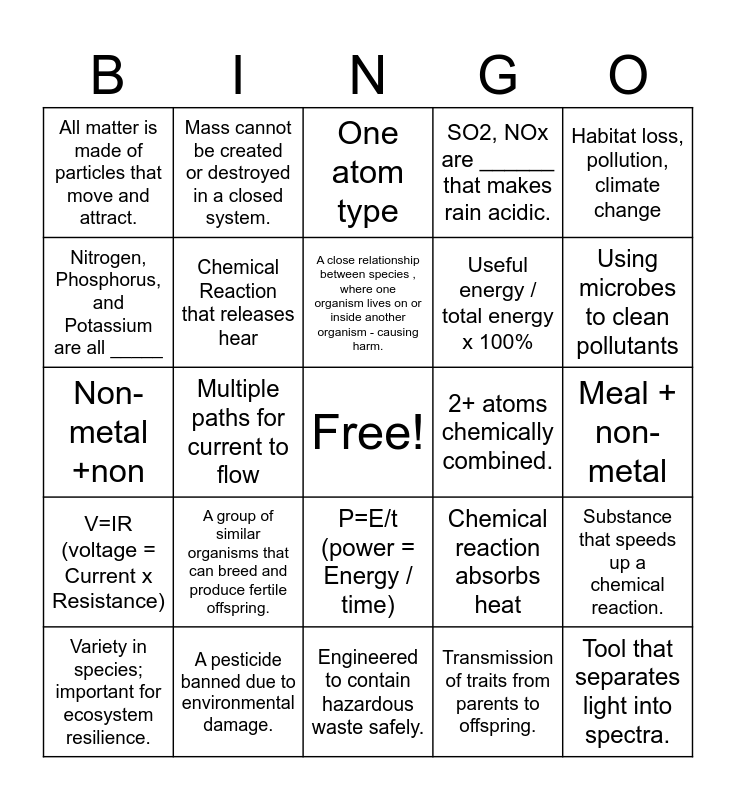 This bingo card has a free space and 24 words: Variety in species; important for ecosystem resilience., A group of similar organisms that can breed and produce fertile offspring., A close relationship between species , where one organism lives on or inside another organism - causing harm., Transmission of traits from parents to offspring., Habitat loss, pollution, climate change, All matter is made of particles that move and attract., Mass cannot be created or destroyed in a closed system., One atom type, 2+ atoms chemically combined., Meal + non- metal, Non-metal +non, Chemical Reaction that releases hear, Chemical reaction absorbs heat, Substance that speeds up a chemical reaction., Nitrogen, Phosphorus, and Potassium are all _____, A pesticide banned due to environmental damage., Engineered to contain hazardous waste safely., SO2, NOx are ______ that makes rain acidic., Using microbes to clean pollutants, V=IR (voltage = Current x Resistance), Multiple paths for current to flow, P=E/t (power = Energy / time), Useful energy / total energy x 100% and Tool that separates light into spectra..