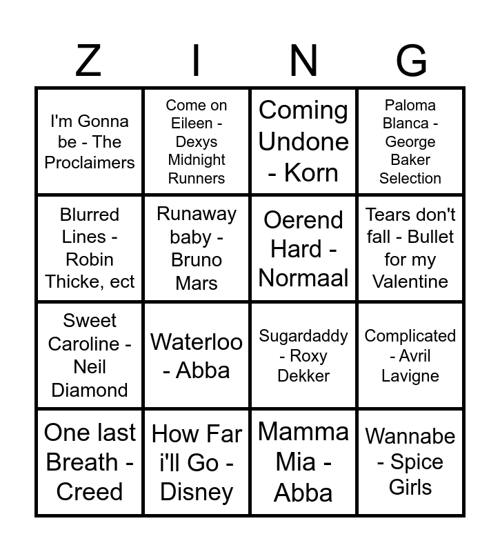 This bingo card has 39 words: Fly as me - Bruno Mars, Boyfriend - Tyler Cassidy, Baat het nier dan schaadt het niet - Bökkers, Oerend Hard - Normaal, In de tram - Natte Visstick, Wait and Bleed - Slipknot, Tears don't fall - Bullet for my Valentine, Het is al laat toch - Racoon, Blurred Lines - Robin Thicke, ect, Wannabe - Spice Girls, Complicated - Avril Lavigne, Paloma Blanca - George Baker Selection, One last Breath - Creed, Mamma Mia - Abba, How Far i'll Go - Disney, Liever te dik in de kist - Rene Karst, Stef Ekkel, La Bamba - Los Lobos, I'm Gonna be - The Proclaimers, You Give Love a bad Name - Bon Jovi, Don't Stop Believin' - Journey, Runaway baby - Bruno Mars, Uptown Girl - Billy Joel, Sweet Caroline - Neil Diamond, Waterloo - Abba, Piano man - Billy Joel, Walking on Sunshine - Dancing Queen, Africa - TOTO, We are the Champions - Queen, Sweet Child o'mine - Guns n'Roses, Come on Eileen - Dexys Midnight Runners, 99 Luftballons- Nena, Take on me - A-ha, Coming Undone - Korn, Bodies - Drowning Pool, Chop Suey! - System of a Down, Die MF Die - Dope, Fuel - Metallica, Sugardaddy - Roxy Dekker and Sweet Monica - Meltheads..