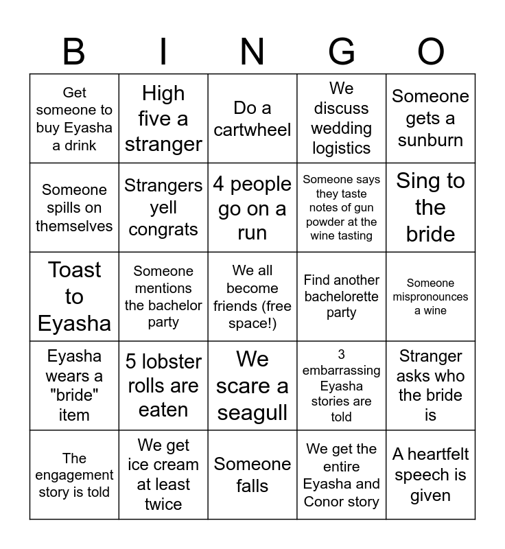 This bingo card has a free space and 24 words: 5 lobster rolls are eaten, We get ice cream at least twice, 4 people go on a run, The engagement story is told, Someone gets a sunburn, Get someone to buy Eyasha a drink, Someone spills on themselves, High five a stranger, Find another bachelorette party, We scare a seagull, Someone says they taste notes of gun powder at the wine tasting, Toast to Eyasha, 3 embarrassing Eyasha stories are told, Stranger asks who the bride is, Strangers yell congrats, We get the entire Eyasha and Conor story, Someone mispronounces a wine, Do a cartwheel, Sing to the bride, Someone mentions the bachelor party, A heartfelt speech is given, Eyasha wears a "bride" item, We discuss wedding logistics and Someone falls.