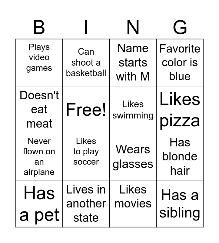 This bingo card has 16 words: Lives in another state, Has blonde hair, Name starts with M, Plays video games, Never flown on an airplane, Can shoot a basketball, Wears glasses, Likes movies, Doesn't eat meat, Free!, Has a pet, Favorite color is blue, Likes to play soccer, Likes pizza, Likes swimming and Has a sibling.