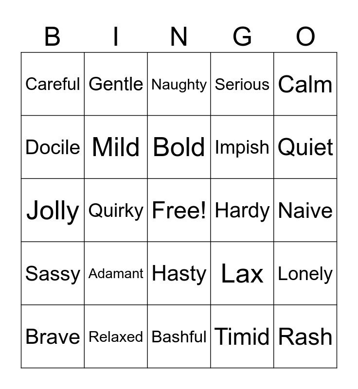 This bingo card has a free space and 25 words: Adamant, Bashful, Bold, Brave, Calm, Careful, Docile, Gentle, Hardy, Hasty, Impish, Jolly, Lax, Lonely, Mild, Modest, Naive, Naughty, Quiet, Quirky, Rash, Relaxed, Sassy, Serious and Timid.