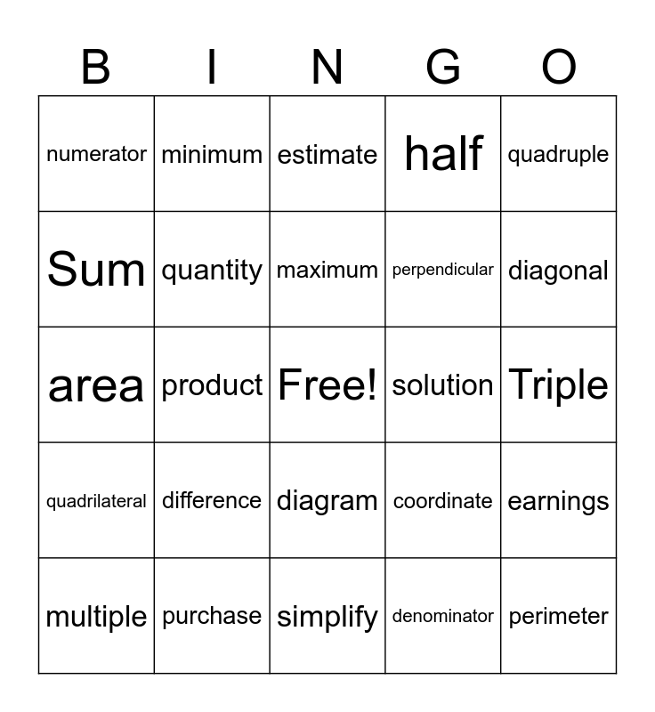 This bingo card has a free space and 42 words: fractions, maximum, divisor, difference, denominator, earnings, perimeter, factor, estimate, diagram, Triple, diagonal, product, quadruple, digits, coordinate, formula, area, dividend, minimum, Sum, double, Quotient, numerator, horizontal, vertical, perpendicular, parallel, x-intercept, y-intercept, operation, quadrilateral, quantity, simplify, total, multiple, purchase, solution, vertex, origin, half and evaluate.