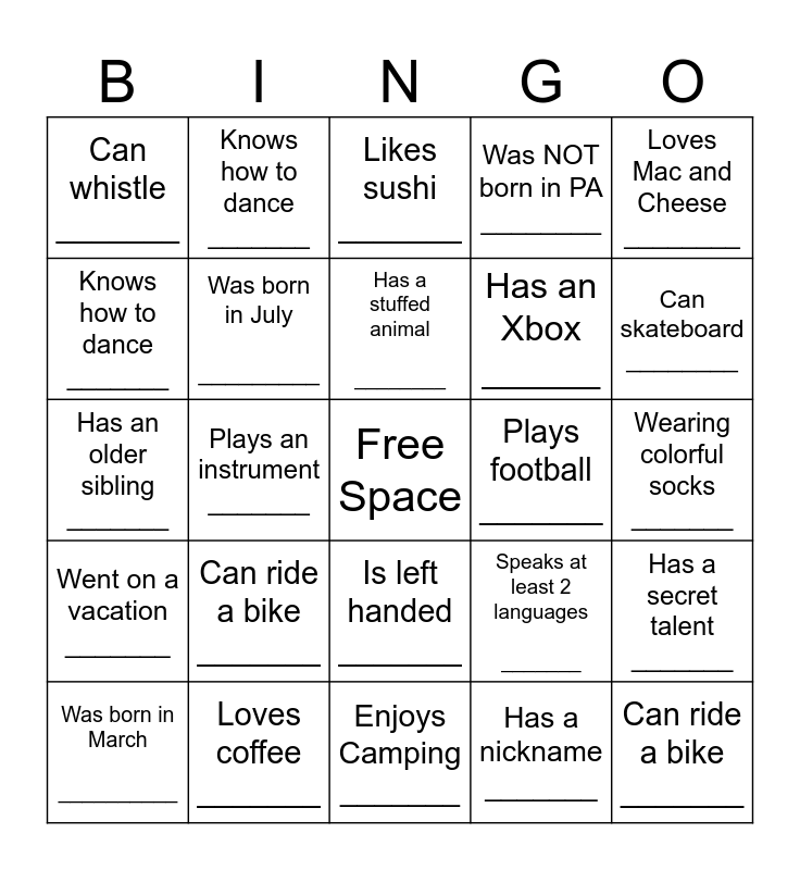This bingo card has a free space and 32 words: Has a nickname _______, Is wearing jeans ________, Plays an instrument _______, Has a Dog _______, Went on a vacation _______, Was born in July _________, Loves Mac and Cheese ________, Has a secret talent _______, Knows how to dance _______, Loves vegetables _______, Has a stuffed animal ________, Likes sushi _______, Likes to swim ________, Can whistle _______, Plays football _______, Was NOT born in CA ________, Was born in March __________, Has an older sibling _______, Is left handed _______, Can ride a bike _______, Speaks at least 2 languages _______, Plays soccer _______, Wearing colorful socks _______, Loves coffee _______, Can ride a bike _______, Was NOT born in PA ________, Has an Xbox ______, Knows how to dance _______, Can whistle _______, Enjoys Camping _______, Has a nickname _______ and Can skateboard ________.