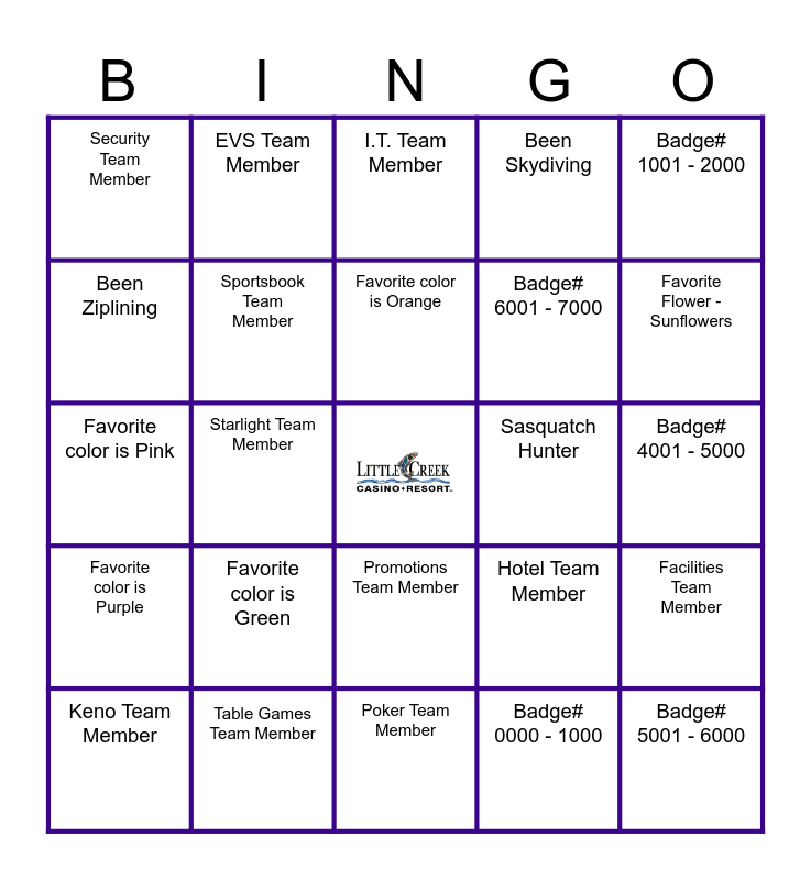 This bingo card has a free space and 32 words: Badge# 0000 - 1000, Favorite color is Blue, Starlight Team Member, Cage Team Member, Favorite color is Purple, Sportsbook Team Member, Badge# 1001 - 2000, Facilities Team Member, EVS Team Member, Deli Team Member, Favorite color is Orange, I.T. Team Member, Badge# 2001 - 3000, Spa Team Member, Sasquatch Hunter, Badge# 3001 - 4000, Keno Team Member, Favorite color is Pink, Promotions Team Member, Favorite color is Green, Hotel Team Member, MIS Team Member, Badge# 4001 - 5000, Table Games Team Member, Badge# 5001 - 6000, Been Skydiving, Badge# 6001 - 7000, Been Ziplining, Security Team Member, Poker Team Member, Favorite Flower - Orchids and Favorite Flower - Sunflowers.