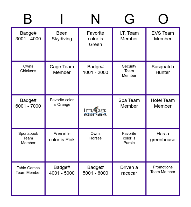 This bingo card has a free space and 36 words: Badge# 0000 - 1000, Favorite color is Blue, Starlight Team Member, Cage Team Member, Favorite color is Purple, Sportsbook Team Member, Badge# 1001 - 2000, Facilities Team Member, EVS Team Member, Deli Team Member, Favorite color is Orange, I.T. Team Member, Badge# 2001 - 3000, Spa Team Member, Sasquatch Hunter, Badge# 3001 - 4000, Keno Team Member, Favorite color is Pink, Promotions Team Member, Favorite color is Green, Hotel Team Member, Has a greenhouse, Badge# 4001 - 5000, Table Games Team Member, Badge# 5001 - 6000, Been Skydiving, Badge# 6001 - 7000, Been Ziplining, Security Team Member, Owns Chickens, Favorite Flower - Orchids, Favorite Flower - Sunflowers, Driven a racecar, Owns Horses, Collects Gem Stones/Rocks and Badge# 7001 - 8000.