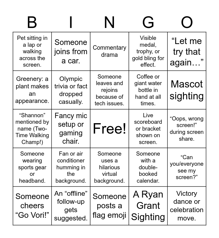 This bingo card has a free space and 65 words: “You're on mute.”, “Can you hear me now?”, Someone freezes mid-sentence., “Can you/everyone see my screen?”, Person joins without video, then apologizes., Someone forgets they’re unmuted while snacking., Someone joins from a car., “I think you're frozen.”, Someone leaves and rejoins because of tech issues., A surprise guest: pet, partner, or child pops in., Someone uses a hilarious virtual background., Echo from someone not using headphones., “Oops, wrong screen!” during screen share., “Let me try that again…”, Visible pile of laundry or clutter in the background., Greenery: a plant makes an appearance., Fancy mic setup or gaming chair., Pet sitting in a lap or walking across the screen., Someone clearly sitting on a bed or couch., Coffee or giant water bottle in hand at all times., Fan or air conditioner humming in the background., Someone wearing sports gear or headband., Visible medal, trophy, or gold bling for effect., Someone waving a flag (real or homemade)., Someone holding or juggling random office items., Pet in costume or with a race number., A handmade Vori Mascot drawing pinned up., Participant aggressively trash-talking (playfully!)., Victory dance or celebration move., Someone making Olympic music noises (🎺 "Duh-duh-duh-duhhhhh!"), Someone cheers “Go Vori!”, Slack message notification heard during call., Someone types in chat: “Wait what was the question?”, Team member visibly multitasking., Someone with a double-booked calendar., An “offline” follow-up gets suggested., Someone suddenly disappears mid-call (tech drop)., “Shannon” mentioned by name (Two-Time Walking Champ!), A Ryan Grant Sighting, Someone references past Office Olympics., Olympic trivia or fact dropped casually., A background that looks like a stadium or gym., Live scoreboard or bracket shown on screen., Medal ceremony takes place, Reference to an athlete’s injury or comeback, Someone says "Vori Olympics", Mascot sighting, Tie between competitors, Surprise win, Someone mispronounces an athlete’s name, Slack message with Olympic emoji, Medal count debate, Someone says "I could totally do that", Someone posts a flag emoji, Debate over judging fairness, Someone mentions Simone Biles, Unexpected record broken, Commentary drama, Uniforms spark discussion, Someone talks about curling (wrong season!), “This is rigged!” comment, Someone wears Olympic gear, Streaming service crashes, A commentator gets excited over nothing and Someone brings themed snacks.