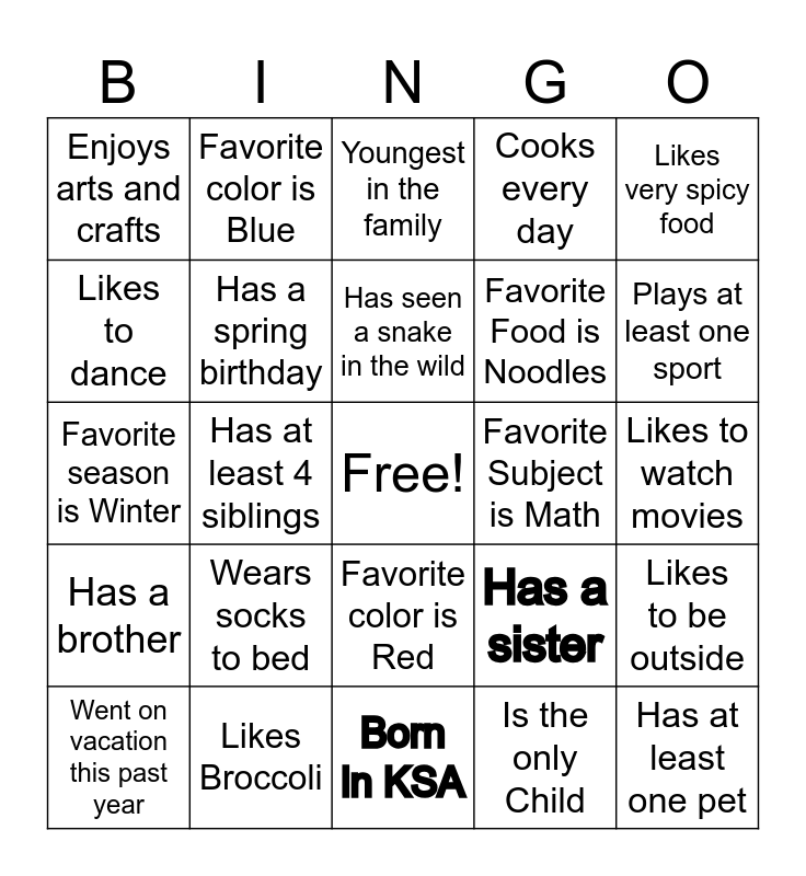 This bingo card has a free space and 24 words: Wears socks to bed, Likes Broccoli, Has seen a snake in the wild, Went on vacation this past year, Likes very spicy food, Enjoys arts and crafts, Likes to dance, Favorite color is Blue, Favorite Subject is Math, Favorite color is Red, Favorite Food is Noodles, Favorite season is Winter, Has a sister, Likes to be outside, Has a spring birthday, Is the only Child, Likes to watch movies, Youngest in the family, Plays at least one sport, Has at least 4 siblings, Has at least one pet, Has a brother, Cooks every day and Born in KSA.
