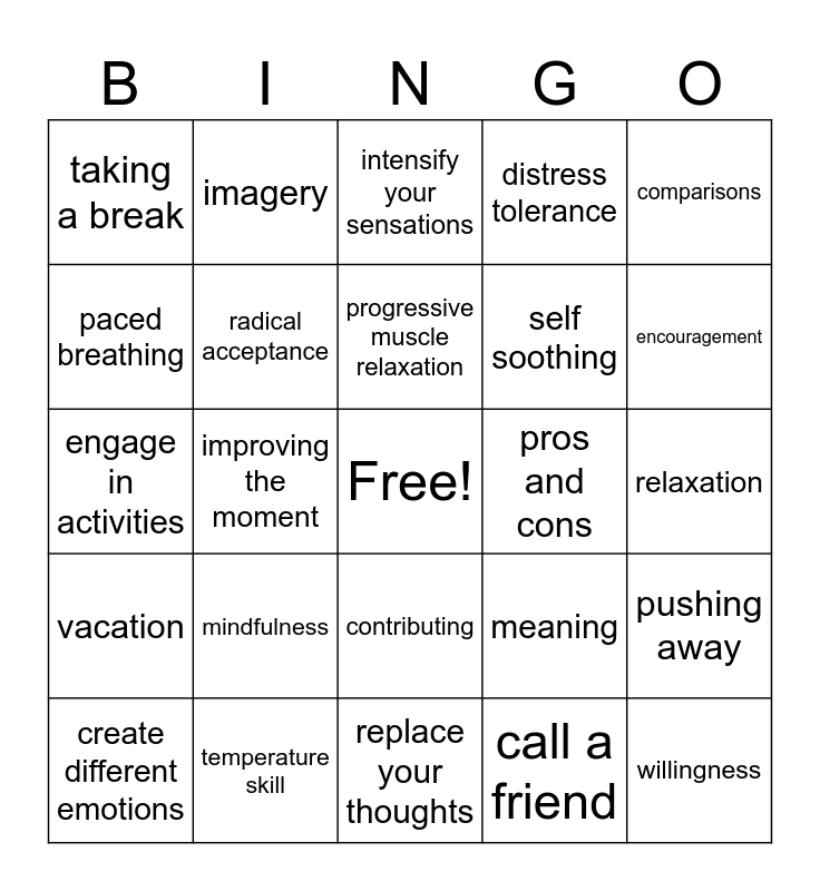 This bingo card has a free space and 24 words: mindfulness, temperature skill, progressive muscle relaxation, create different emotions, comparisons, taking a break, paced breathing, imagery, pros and cons, contributing, self soothing, engage in activities, meaning, pushing away, radical acceptance, call a friend, relaxation, intensify your sensations, encouragement, improving the moment, willingness, vacation, distress tolerance and replace your thoughts.