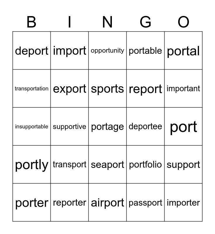 This bingo card has 25 words: transport, airport, sports, porter, portal, deport, transportation, import, deportee, seaport, report, insupportable, portfolio, support, export, importer, port, opportunity, important, supportive, portage, reporter, portly, portable and passport.