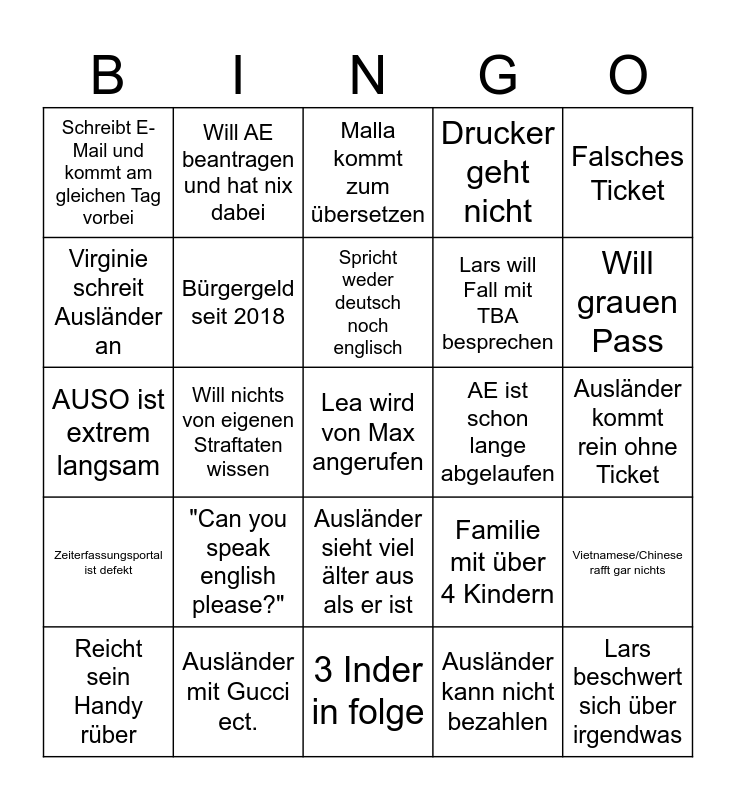 This bingo card has 25 words: "Can you speak english please?", 3 Inder in folge, Spricht weder deutsch noch englisch, Reicht sein Handy rüber, Falsches Ticket, Schreibt E-Mail und kommt am gleichen Tag vorbei, Virginie schreit Ausländer an, Will AE beantragen und hat nix dabei, AE ist schon lange abgelaufen, Ausländer sieht viel älter aus als er ist, Lars will Fall mit TBA besprechen, AUSO ist extrem langsam, Familie mit über 4 Kindern, Vietnamese/Chinese rafft gar nichts, Bürgergeld seit 2018, Lars beschwert sich über irgendwas, Ausländer kommt rein ohne Ticket, Malla kommt zum übersetzen, Will grauen Pass, Will nichts von eigenen Straftaten wissen, Lea wird von Max angerufen, Ausländer mit Gucci ect., Zeiterfassungsportal ist defekt, Drucker geht nicht and Ausländer kann nicht bezahlen.