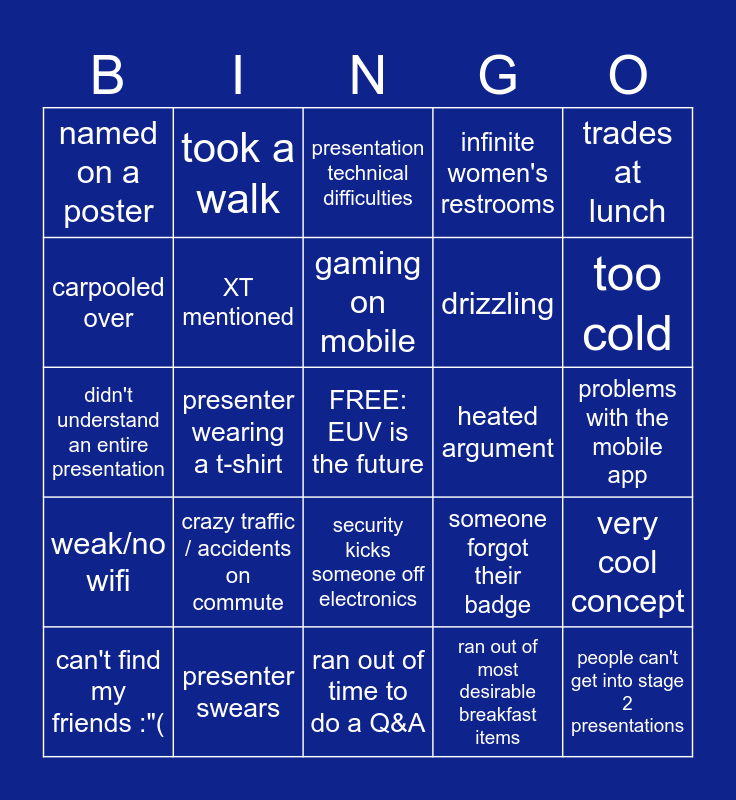 This bingo card has a free space and 30 words: presenter swears, multiple women in one presentation, presenter wearing a t-shirt, questionable joke in a presentation, named on a poster, presentation technical difficulties, XT mentioned, security kicks someone off electronics, heated argument, ran out of time to do a Q&A, problems with the mobile app, people can't get into stage 2 presentations, ran out of most desirable breakfast items, napping in the audience, too cold, too hot, someone forgot their badge, weak/no wifi, crazy traffic / accidents on commute, trades at lunch, didn't understand an entire presentation, new WT fellow, took a walk, drizzling, carpooled over, infinite women's restrooms, very cool concept, can't find my friends :"(, gaming on mobile and SDEV shoutout.