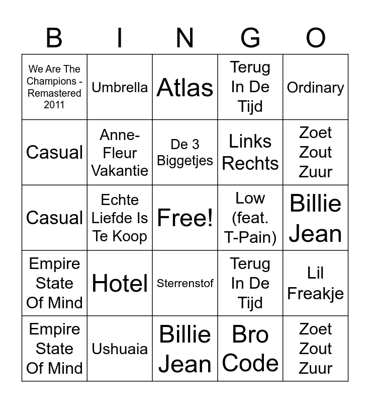 ⚠ This card has duplicate items: Casual (2), Lotje (2), Anne-Fleur Vakantie (2), Ushuaia (2), Sterrenstof (2), De 3 Biggetjes (2), Macarena (2), Ordinary (2), Empire State Of Mind (2), Echte Liefde Is Te Koop (2), Terug In De Tijd (2), Zoet Zout Zuur (2), Billie Jean (2), Low (feat. T-Pain) (2), Hotel (2), Umbrella (2)